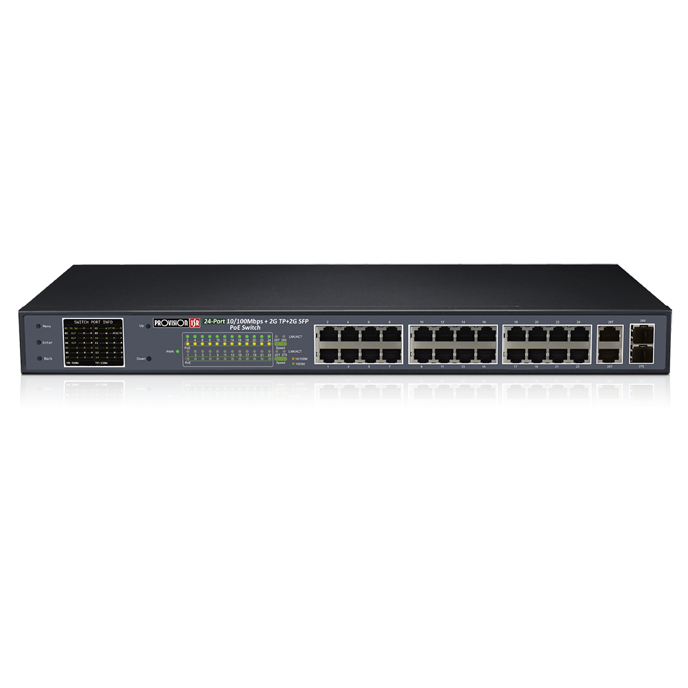 Switch PoE 24 Downlink 10/100Mbps + 2 Porte SFP 370W con Modalità CCTV