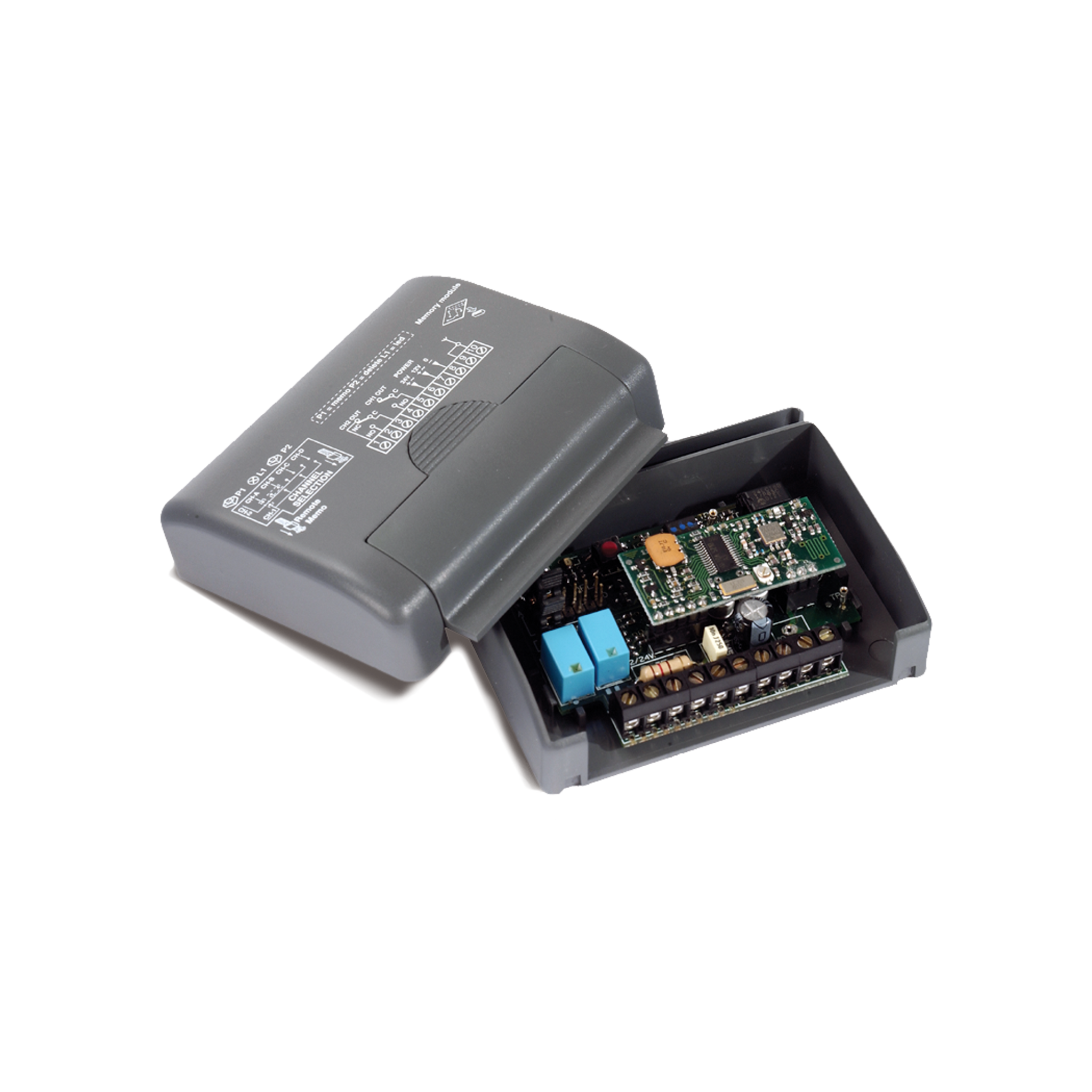 Contenitore per applicazioni interne IP20.␞Circuito elettronico con connessione su morsettiera a 10 vie.␞Fornito con 2 relè impulsivi.␞Possibilità di memorizzare fino a 300 codici.