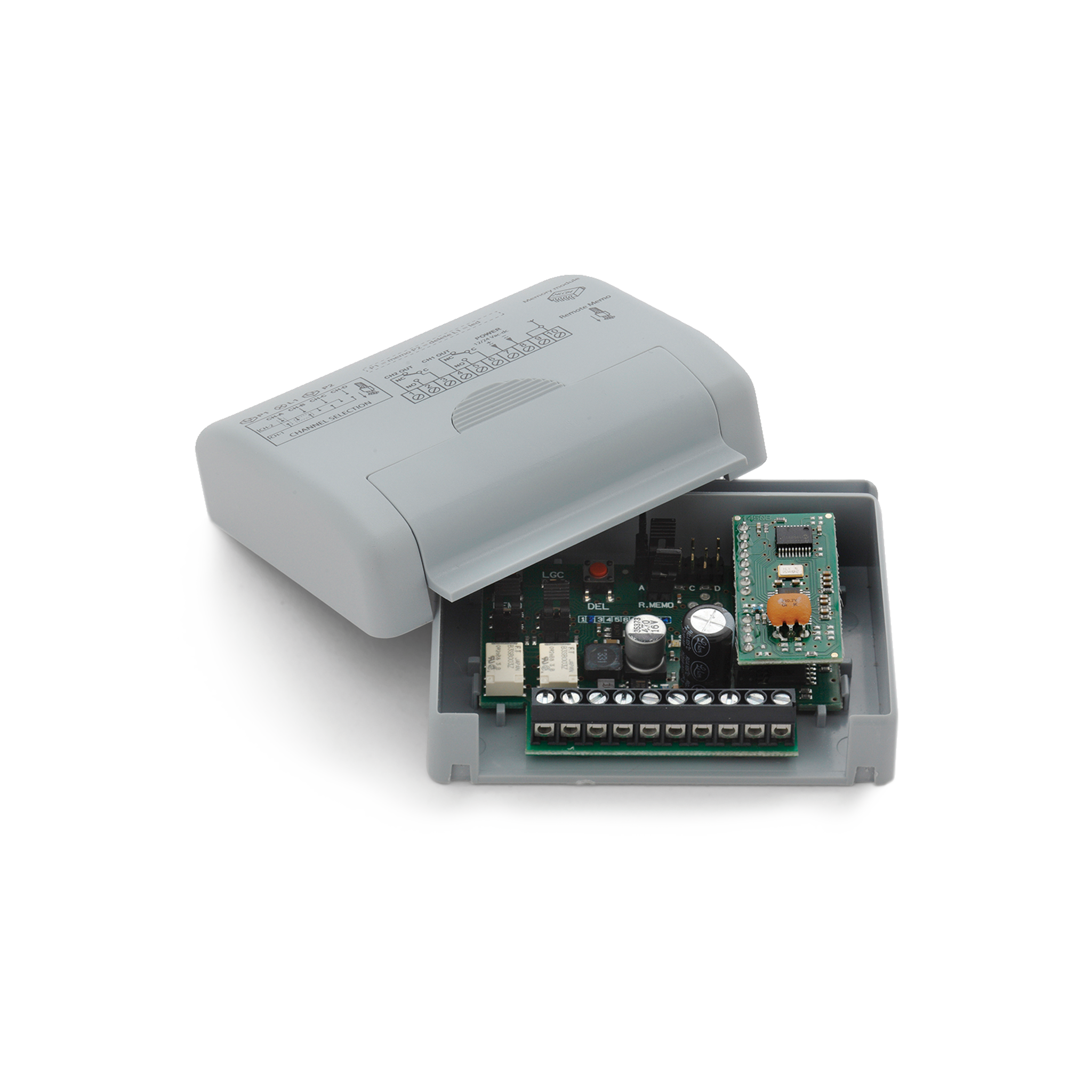 Contenitore per applicazioni interne IP20.␞Circuito elettronico con connessione su morsettiera a 10 vie.␞Fornito con 2 relè impulsivi.␞Possibilità di memorizzare fino a 1000 codici.