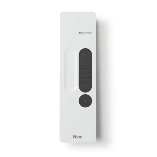 Trasmettitore bidirezionale portatile, monocanale, con slider e tasto Sole On/Off. Lo slider consente, ad esempio, il dimmeraggio graduale delle luci oppure la regolazione dei termoradiatori, se equipaggiati con appositi ricevitori radio Nice.Viene fornita anche un’apposita staffa di supporto a parete.