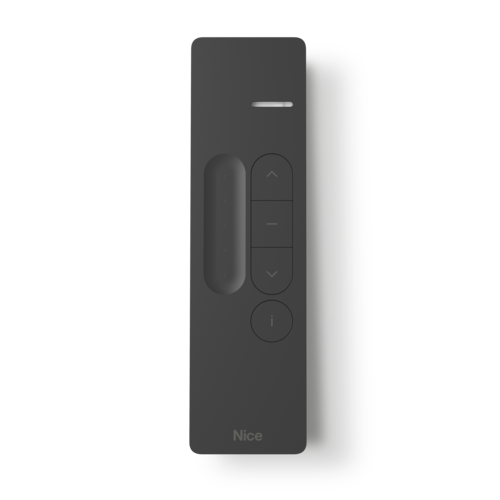 Trasmettitore bidirezionale portatile, monocanale, con slider e tasto Sole On/Off. Lo slider consente, ad esempio, il dimmeraggio graduale delle luci oppure la regolazione dei termoradiatori, se equipaggiati con appositi ricevitori radio Nice.Viene fornita anche un’apposita staffa di supporto a parete.